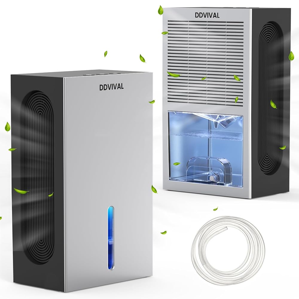 - 【Auto Shut-off & Extra drain hose】DDVIVAL dehumidifier have auto shut-off feature prevents leaking or overflow when water tank is full. The red indicator flashes to remind you to empty the tank. Its auto-off function makes it be safe to use even when you are not at home. The dehumidifier is also equipped with a drain hose(1.5m), which allows the dehumidifier to automatically and continuously drain water, eliminating the need to empty the water tank all the time.