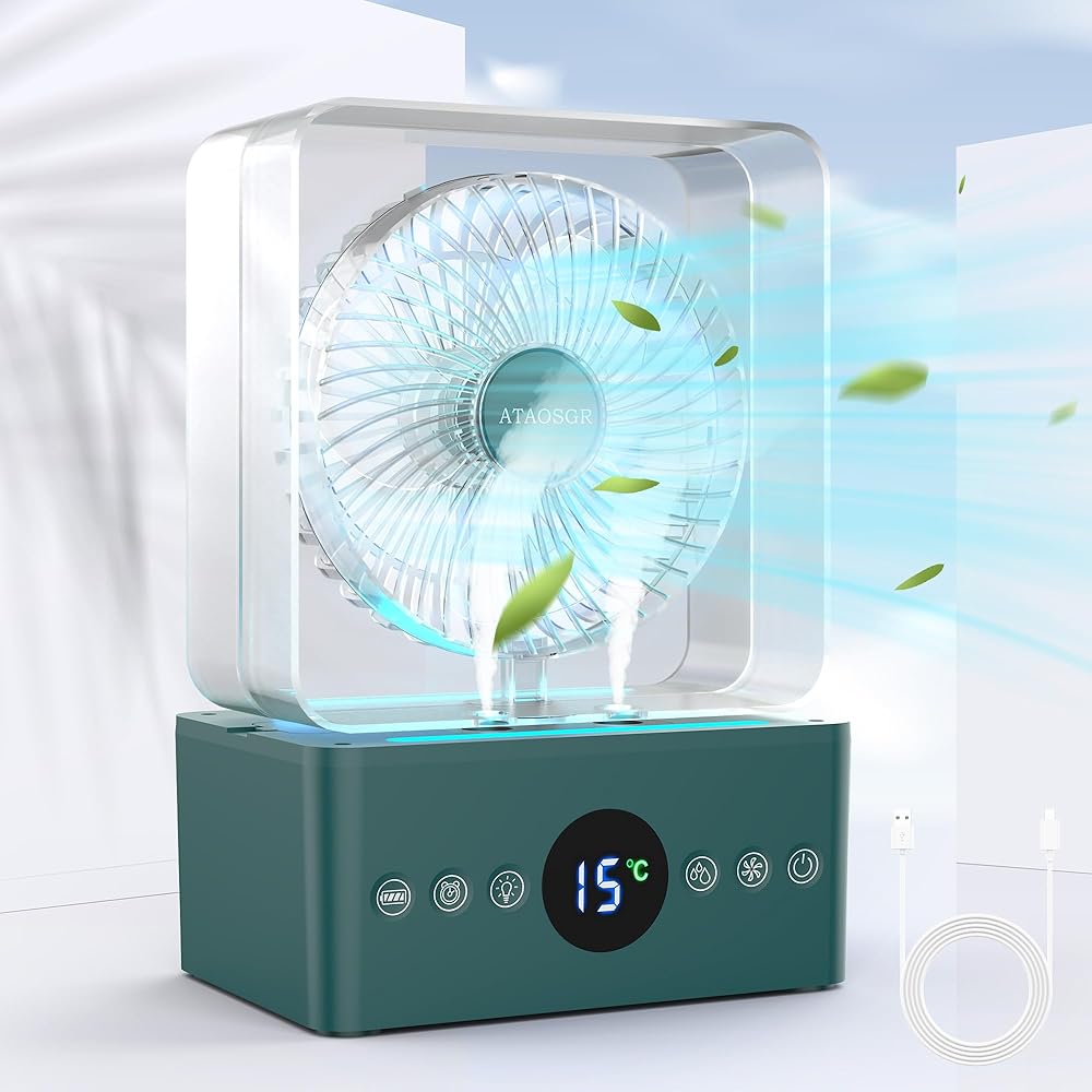 - Dazzling light show]: This desktop fan and portable evaporative cooler light show is very beautiful, it has red, blue, green, and other light colours, lights and a variety of flashing ways, the material is made of environmentally friendly ABS material!